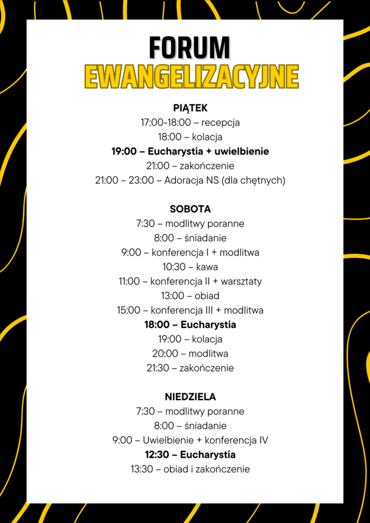 Alleluja! Wiele osób dopytuje jak będzie wyglądało zbliżające się Forum Ewangelizacyjne. W odpowiedzi na oczekiwania udostępniamy ramowy plan działania. Jeśli nie możesz przybyć na cały weekend, może uda Ci się uczestniczyć chociaż w sobotę?